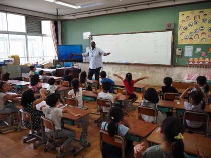 クラーク・テビン先生の英語です。1年生も英語には興味津々です。クラーク先生に質問攻めでした。さすがのテビン先生も元気な1年にはびっくりです。