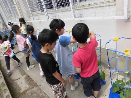 あさがおのつるが伸びてきました。地面をはっているつるは支柱にまきつけてあげました。増えてきたはっぱに触り,「フワフワ」「シャクシャク」「ざらざら」などぴったりくる表現を口々に言っていました。