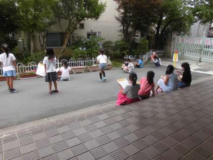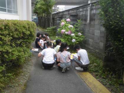 今日の天気予報は昼から雨…。2時間目,雨が降る前にと思い,昨日取り組む予定だったアジサイのスケッチをしました。校内に咲いているアジサイを見つけ,細かい花びらをよく見ながら下描きをしました。(結局,放課後まで雨は降らず,水泳学習も予定通りできました。)