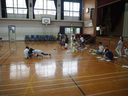 6月20日 3年生の理科では、ゴムを使って、弾性力を確かめています。ゴムを伸ばすこととそれによって、動いていく模型の車の距離の関係を調べています。中学校理科で学習する「フックの法則」につながっていく学習です。みんな面白そうに取り組んでいます。