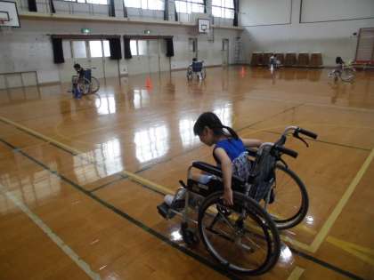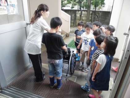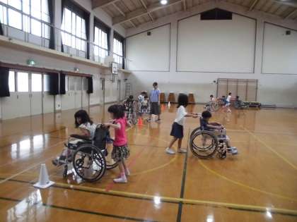 ともだちの日の取組で,3組の先生とお友だちと車いすについて学習しました。車いすでの移動の仕方や必要性などのお話を聞いた後,実際に乗ったり押したりしました。実際に使ってみると「自分で進むのが難しかった。」「思っていたより腕がつかれた。」など見た目と違った大変さを感じたようでした。