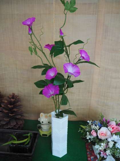 校長室の前の棚の上に新しいお花が飾られています。アサガオです。実はこれは造花で、花弁も実物のアサガオのように染められています。季節の移ろいが感じられます。地域の方よりいただきました。どうもありがとうございました。