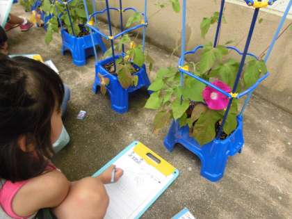 1年生が植えたあさがおも花が咲きました。もうすぐ咲きそうなつぼみもたくさんみられ,これから楽しみです。子どもたちは何色の花が咲くかドキドキワクワクしています。