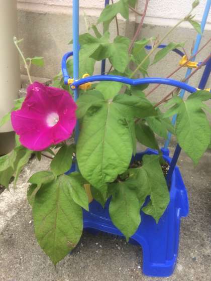 学校はお休みですが,あさがおが3つ咲いていました。