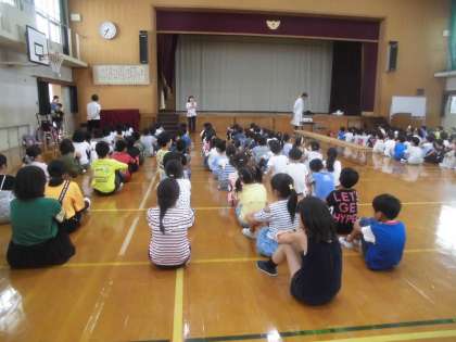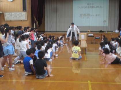 昨日,7月の朝会では、校長先生が,理科の実験として体育館で空気砲を披露してくださいました。みんな興味深く参加していましたが,四年生の子どもたちは,特に身を乗り出して見ているように感じました。みんな実験大好きですね!