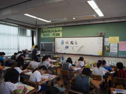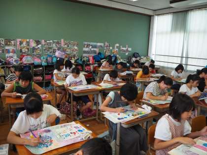 線と色を組み合わせて紫陽花の花を画用紙上に再現します。みんな丁寧に描きこんでいます。