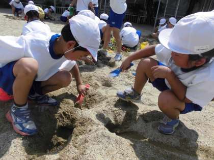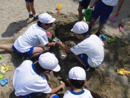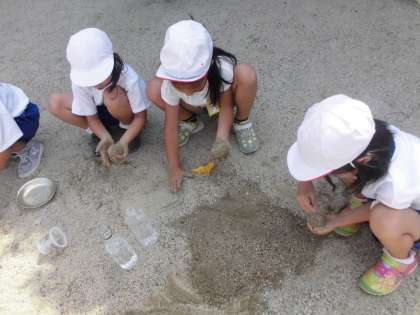 砂や土の感触を楽しみながら,造形活動をしました。カップを使ったケーキ,お城や山や川など思い思いに作っていました。川には水を流し,ダムでせき止めたりといろいろ工夫していました。また,友だちと協力したり,どうしたらいいか相談したりする姿も見られました。