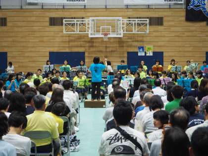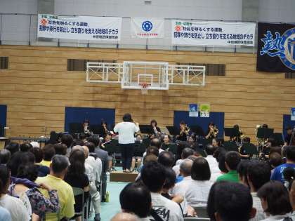 7月16日 第68回社会を明るくする運動 中京音楽フェスティバルが京都両洋高校の第2体育館で行われました。中京中、朱雀中、北野中、西京高校付属中、西ノ京中、京都御池中、京都両洋高校の吹奏楽部がそれぞれ演奏を行いました。中学生や高校生がそれぞれの元気さやスキルを発揮しての演奏で、なかなか聞きごたえがありました。朱雀中、西ノ京中の吹奏楽部には朱六小の卒業生もいるとか。朱六小のみなさんも卒業すると、このような場所で演奏したりする機会もあるのですね。今中学校では、夏季選手権大会の真っ最中です。この市内大会で上位に入れば、府下大会、近畿大会、全国大会へと進んでいきます。朱六小のみなさん、みなさんの未来には、大きな舞台が待っています。今は未来につながっているのですよ。将来がたのしみですね。頑張ってください。写真は朱雀中と西ノ京中の吹奏楽の演奏のようすです。