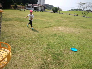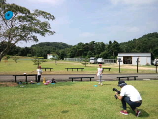 広い芝生広場でフライングディスクゴルフを楽しんでいます。