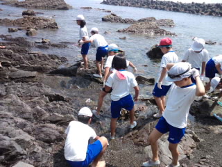 このように潮が引いたときにできる岩場の水たまりには,いろいろな生き物がいます。何と出会うことができるでしょうか?