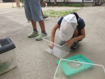 生活科の学習で,校庭の生き物を探しに行きました。草の中にかくれている虫たちを上手につかまえていました。