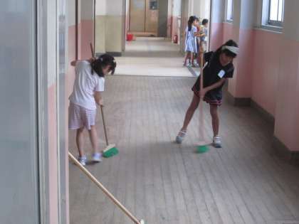 掃除の時間。掃くのが上手なほうきの係。そして掃き終わるタイミングを見て床拭きをはじめる係。その間に教室中を美しく拭き掃除する上拭き係。ろうかも洗面所も手際よく掃除できていることにびっくりしました。掃除も上手になってきました!