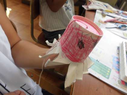 紙コップを使って,風で回るおもちゃをつくりました。回る仕組みを作った後,色をぬったり,かざりつけをしたりしました。扇風機の風を当てたり息を吹きかけたりすると見える模様や色が変わることに驚いていました。最後は,運動場に出て走ってみました。