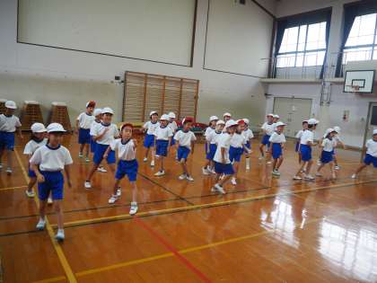 9月5日(水)1・2年生の運動会の練習です。1・2年生合同で演舞の練習です。先生の見本をみて一生懸命、練習しています。