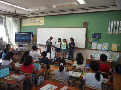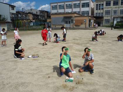 9月5日(水)5年生は、家庭科で製作したナップザックのお披露目をしていました。みんなの力作です。そして6年生は太陽と月の学習で運動場で観察です。この日は午前中月が見えるので、太陽と月の位置関係、そして太陽を観察するための専用グラスをつかって、太陽の位置を確認して、さらに月のようすを見ていました。しかしながらこの時間帯月は雲に隠れて見えませんでした。ちょっと残念な様子でした。