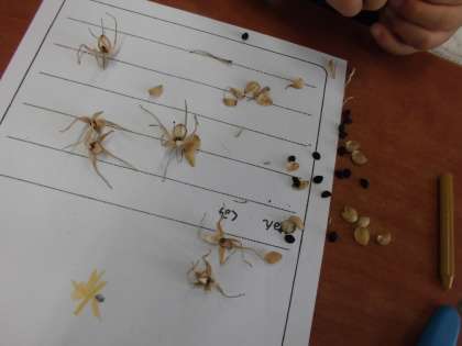 あさがおの花が枯れた後にできた種を観察しました。気づいたことを見つけよカードに絵や文章でまとめました。「殻の中は分かれていていくつも種が入っている。」「殻の大きさによって種の大きさや数は違う。」などしっかり見ることができました。