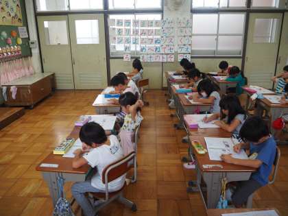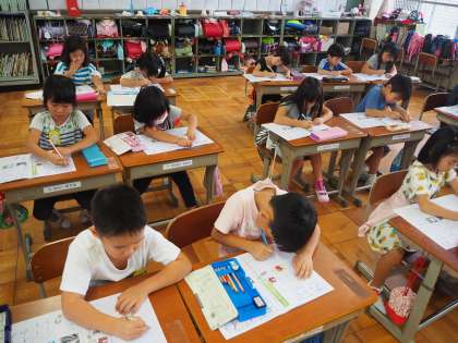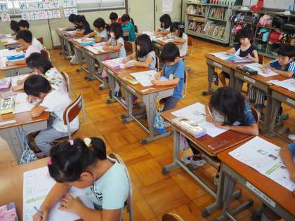 9月11日(火)1年の書き方の授業です。もうすぐ小学校に入学して半年になろうとしています。字も少しずつ上手になってきました。読むこと、書くことは学習の基本です。文字を大切に丁寧に書いてほしいと思います。
