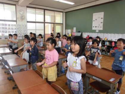 「Hello song」でのあいさつの後,色と数字の言い方を学習しました。言い方を繰り返し練習し,最後はキーワードゲームで楽しみました。