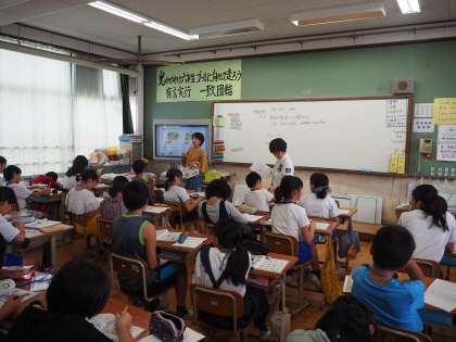 6年の英語は「〜について about 」の使い方を学習していました。この日は西ノ京中学校の英語科北福地先生がお見えになり、担任の先生と一緒に授業を進めていました。