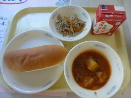 牛肉・たまねぎ・じゃがいもを一緒に煮込みました。トマト味が濃厚で,子ども達は「おいしい!」と喜んで食べていました。バジルが,アクセントになっていました。
