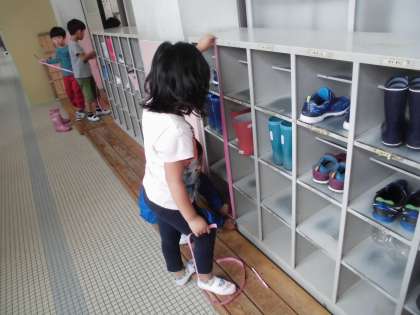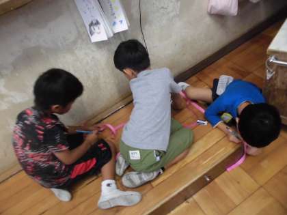 動かせないものの長さを調べるのに,テープを使うといいことを学習しました。一人一本の紙テープを持って,教室の中や廊下のいろいろな物の長さを調べました。