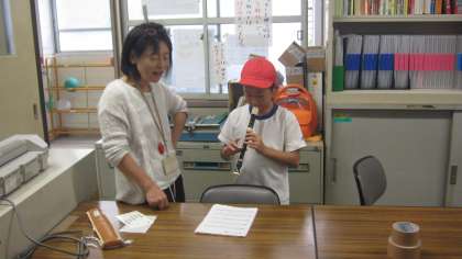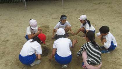 砂場で山を作ったり,リコーダーのテストを受けたりしています。