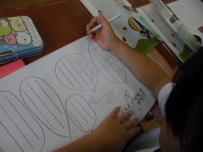 国語の教科書が「下」になりました。最初の学習は「くじらぐも」です。声に出して楽しく音読しています。子どもたちやくじらぐもの会話を想像しながら,吹き出しにせりふを書いて進めています。