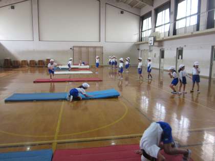 今日からマット遊びの学習です。準備の仕方を覚えました。今日は,前転・後転をしました。