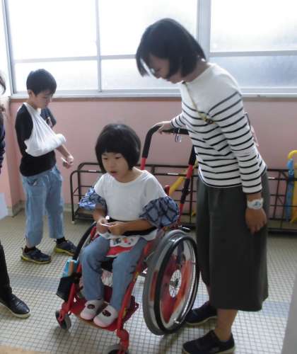 3組のお友だちの車いすを押す子どもたち。初めての体験に興味津々の様子でした。真っ直ぐ,ちょうどいいスピードで押すのは,思ったより難しいようでした。
