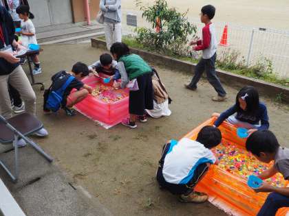 10月20日(土)午前 本校で朱六フェスタが主催のPTA、親児の会や地域のみなさまのご協力の行われました。「こどももおとなも一緒にあそびましょう!!」を合言葉に、晴天の下、PTAや親児の会、地域のみなさまが趣向を凝らしたイベントを用意して、子どもたちを迎えました。またバザーもの行われ、かなりの数の掘り出し物もありました。