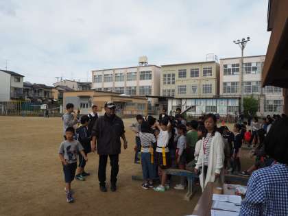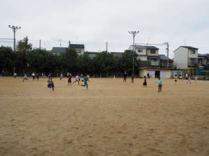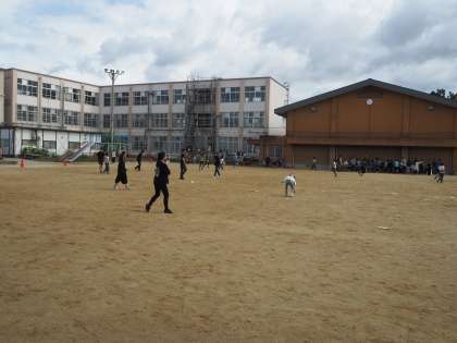 グラウンドでの大おにごっこ大会のようすです。大学生のボランティアや親児の会のみなさんが子どもたちを追っかけています。こどもたちも逃げようと走り回っていました。追っかける大人のほうがつかれてきた模様です。