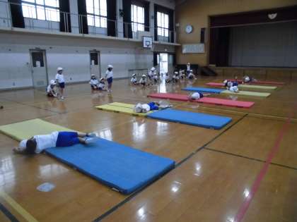 班ごとに協力して「マットあそび」をしています。今日は,体ならしの後,横回りや前回りをしました。上手にできている友だちのいいところを探しながら,一生懸命練習しています。準備や後片付けもバッチリです。