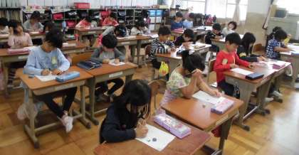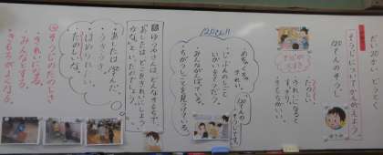 今日のめあては「そうじについて考えよう」でした。掃除の大切さや楽しさについて,「120てんのそうじ」のお話を通して考えました。自分たちの掃除の仕方を振り返り,「今日から150点目指そう!」「みんなと協力したら気持ちがいいね」などいろいろな意見が出ました。