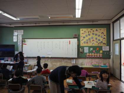 1年では、国語の授業です。見つけたことを文章に書こうというテーマで、各自文章を書いていました。1年生も半年を過ぎると、作文も上手になります。