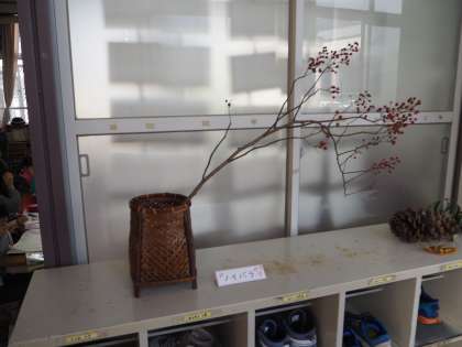 教室の外の廊下には、ノイバラの実のついた枝が竹籠にさしてありました。秋の深ま理を感じます。