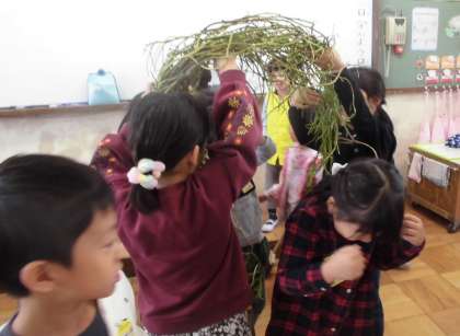おいもの観察が終わったので,つるについていたおいもや葉をとりました。長いつるを束ねると、、、「髪の毛みたい!」「トンネルみたい!」といろいろなものに見えてきました。つるのトンネルを作ると,みんな通りたくて列ができていました。残ったつるを使ってリースをつくる予定です。