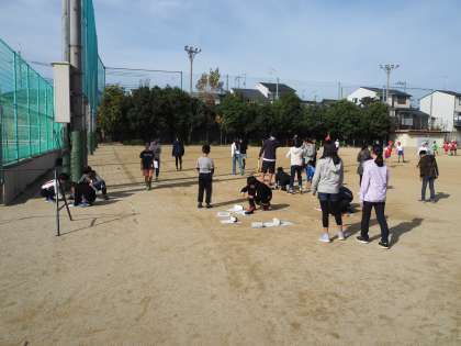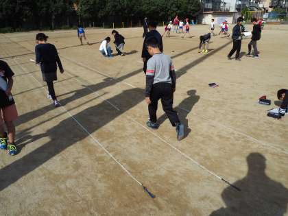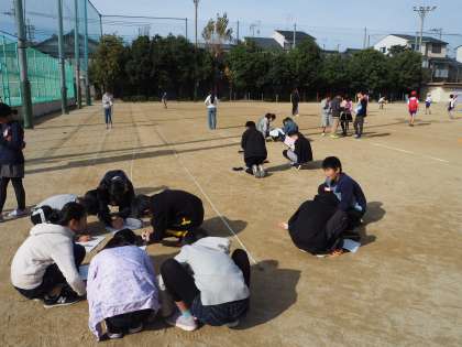 11月16日(金)2時間目のことでした。5年生が砂場付近で何やら活動中、どうやら体育ではなさそうです。算数のノートをもっていました。運動場の一部では巻尺が広げて有りました。