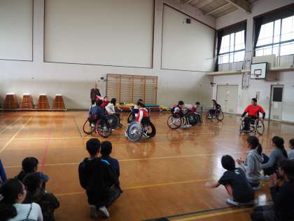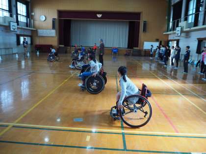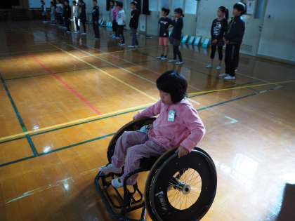 11月16日(金)3時間目と4時間目に 5年生を対象にオリンピック・パラリンピックに向けてのいろんな競技を知ろうという取り組みを行いました。この日は車いすバスケットの選手の方とコーチの方に来ていただき、車いすバスケット用の車いすにのって、実際にバスケットボールのゲームをしました。よくある車いすと違って競技用は軽くて丈夫で、速いスピードが出ます。扱い方を学んだり、ルールを聞いてゲームもしました。