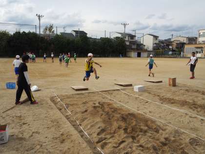 走り幅跳びの最後の時間です。箱をおいて高く飛ぶことを意識することによって、足が上がり、距離も伸びてきます。確かに子どもたちの足が高く上がり、空中姿勢もきれいになってきました。