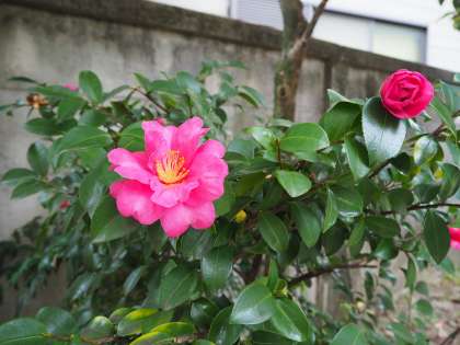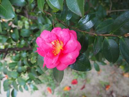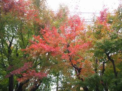 111月19日(火)さざんかが咲き始まました。朱六の森の紅葉も入り付きが鮮やかになってきました。秋から冬へ、季節の移ろいを感じられる朝です。子どもたちの登校時の服装もあたたかそうです。