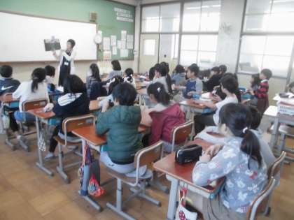 読書週間の取組で,今日の4年生は,図書室の先生による読み聞かせをしていただきました。本の題名は,『ろくべえ まってろよ』 みんな興味深そうに静かに聞いていました。子どもたちは,読み聞かせが大好きなようです。図書室の先生,どうもありがとうございました。
