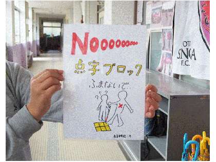 11月22日(木)朱雀中学校1年生で本校の卒業生が本校に掲示板に張ってくださいとポスターを持ってきました。朱雀中学校での総合的な学習で、人にやさしいまち調べをしているそうです。そこで視覚に困りのあるみなさんが利用している点字ブロックを踏んでいる人が多いので、点字ブロックが本当に必要なみなさんが困っているのではないかと考え、注意を呼びかけようという取り組みのひとつです。児童の皆さんの先輩が中学校でどんな学習をしているかが、わかるようで楽しいです。中学生の学びが小学生にも伝わると小学生にも中学生にもプラスになるでしょうね。