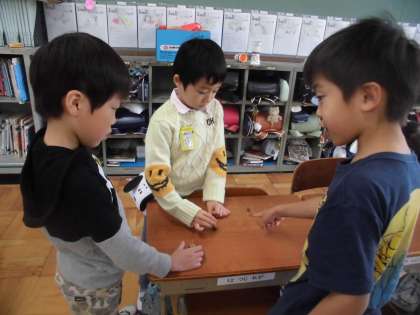 3年生のお兄さんが,こまにしやすいどんぐり「くぬぎ」をたくさん拾ってきてくれました。穴を空けて,つまようじをさすと「どんぐりごま」の完成です。誰が長く回せるかの勝負をしたり,顔を描いたり,色をつけたりと楽しく遊びました。