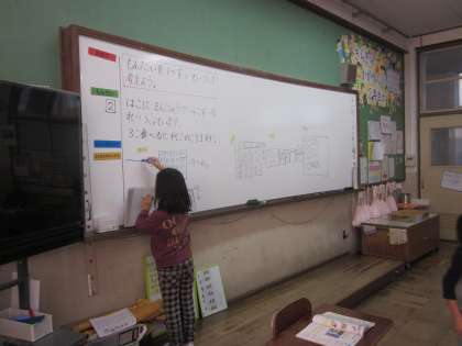 かけ算の学習が一通り終わり,まとめの文章題の学習をしました。問題文を図や絵をつかって一つずつ整理しながら考える学習です。「4こずつ5れつ」の図をかくといろいろな考えがでてきました。どれが正解かな?とみんなで意見を出し合いました。