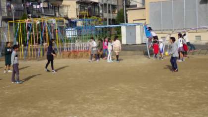 新しい遊び道具(スマイルドッジボール)を使ってバレーボール(円陣パス)をしています。少し柔らかいというボールの特性をいかして様々な遊びができるといいなと思います。