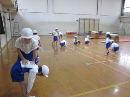 とびばこやマットを準備するのも上手になってきました。準備の後は準備体操・運動です。馬跳びにチャレンジしました。やったことがない人もいたので,小さい馬になって慣れてもらうことからスタートです。
