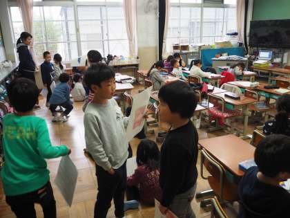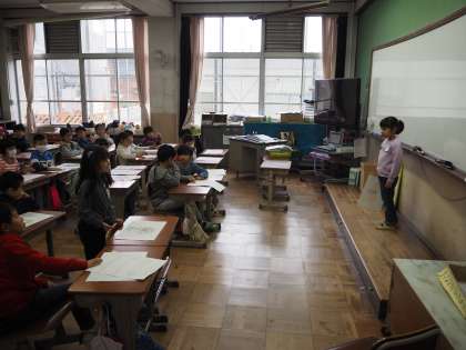 まず教室で、二人で発表をしあって、練習です。そして次はクラス全体の前で発表します。聞いている子どもたちが質問をします。発表する子どもが答えます。