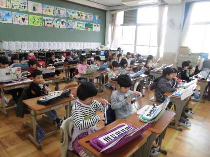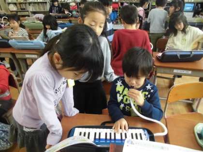 学期末に向け,鍵盤ハーモニカのテストを頑張っています。合格した子は,友だちが上手に吹けているか聴いてくれています。