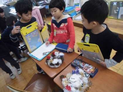 出来上がった「クリスマスかざり」の鑑賞会をしました。友だちの作品のいいところを見つけたり,がんばったところをインタビューして聞いたりしました。