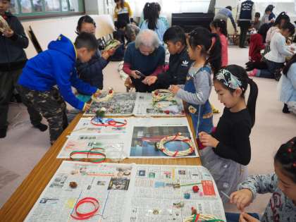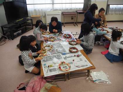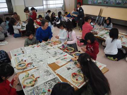 12月7日(土)土曜学習で朱六学区の女性会のみなさまによる「クリスマスリースつくり」を行いました。子どもたちは女性会のみなさんから作り方を教えてもらったり、手伝ってもらったりしながら、おもいおもいのクリスマスリースを作っていました。